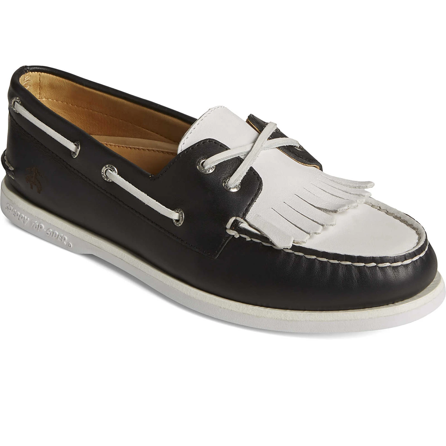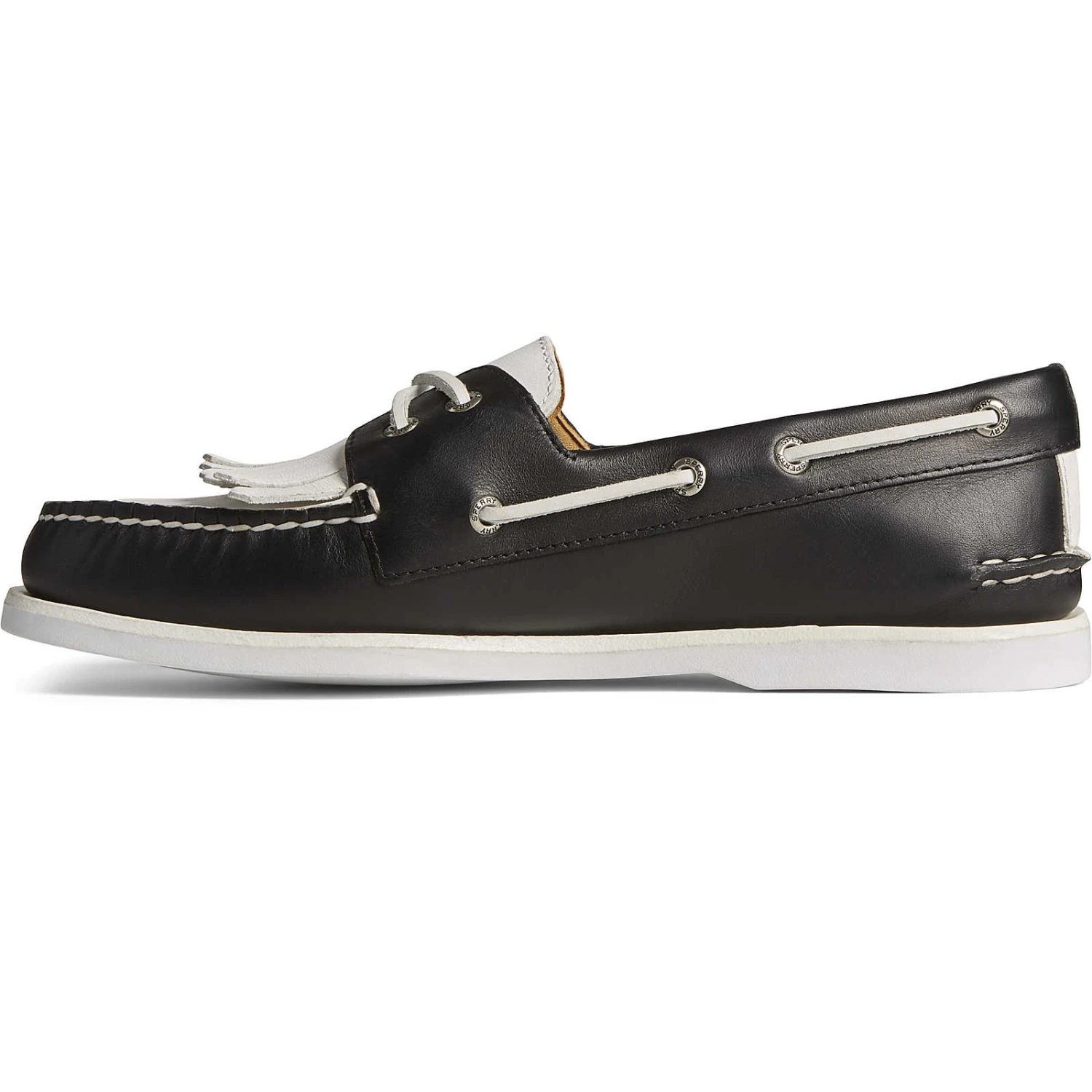 Our most iconic silhouette gets a wedding-ready refresh in our latest collaboration with Brooks Brothers. Perfectly styled to match your tux, these black and white Authentic Original™ 2-Eye boat shoes feature premium full-grain leather uppers with a kiltie fringe design. A full lambskin lining adds extra comfort so you can dance all night long at the reception.